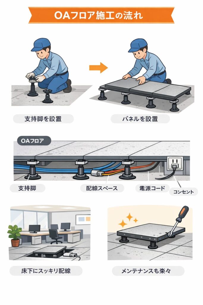 施工方法は、まず支持脚を設置し、その上にパネルを敷き詰めていく形が一般的です。床下に十分な空間が確保されるため、LANケーブルや電源ケーブルを美しく整理でき、配線が露出しない安全でスマートなオフィス環境を実現できます。