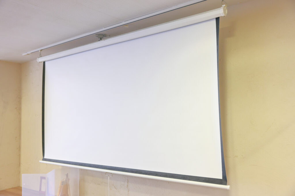 使用していないときに収納できるスクリーンは、施設内のスペースを効率的に活用するのに最適です。手動スクリーンには、下部の取手を引いて昇降させるタイプと、チェーンを操作してスクリーンを動かすタイプの2種類があり、どちらも簡単に操作できます。これらの手動スクリーンは、電動スクリーンに比べてコストを抑えられる点が魅力です。広島配線工事.comでは、お客様の用途や予算に合わせて最適なスクリーンをご提案いたします。