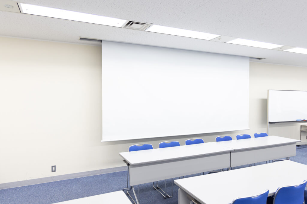 プロジェクターの投影先としてスクリーンを使用する場合、電動スクリーンを天吊りで設置することで、毎回スクリーンを準備する手間を省くことができます。さらに、天井に固定することでスクリーンを収納でき、スペースの有効活用にもつながります。ただし、電動スクリーンを天吊り設置する際には、天井内部に配線を通す必要があり、一部天井の改修を伴うため、専門的な施工が求められます。個人での設置は困難ですが、広島配線工事.comでは、広島県での電動スクリーンの天吊り設置工事に対応しております。お客様のご要望や施設の構造に合わせた最適な設置方法をご提案し、スムーズな工事を実現いたします。