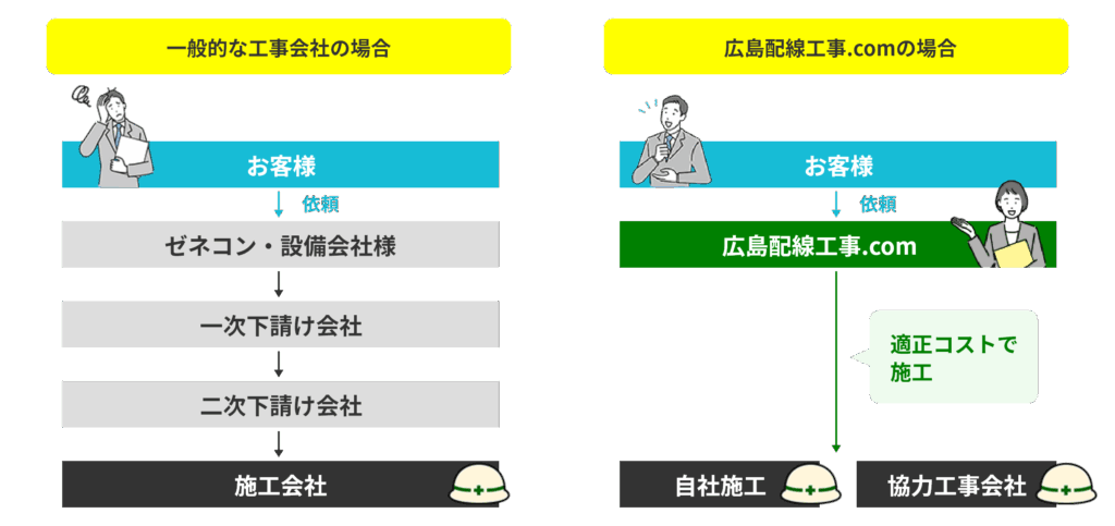 広島配線工事.comでは、自社施工や信頼できる直接施工会社にて工事を行っております。この仕組みにより、可能な限り多重下請け構造を排除し、中間マージンの発生を防ぐことでコストを抑えた施工を可能にしています。お客様には、適正価格で高品質なサービスを提供することをお約束いたします。また、迅速な対応と責任ある管理で、工事の進行をスムーズに進めます。