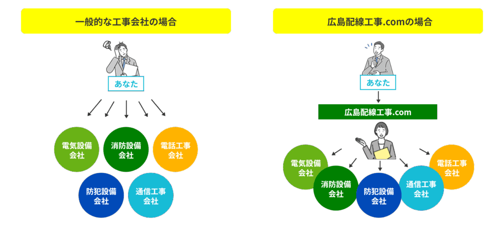 広島配線工事.comは、長年の経験と豊富な施工実績をもとに、LAN工事、電話工事、電気工事など、さまざまな配線工事に一括対応できる体制を整えています。複数の業者へ依頼する手間を省き、工事を円滑に進めるための窓口として、全体の管理と調整を一貫して行います。これにより、お客様は複雑な手続きや調整に煩わされることなく、安心して工事を進めることが可能です。さらに、広島配線工事.comでは、配線工事に関するご相談から施工完了まで、一貫して丁寧に対応いたします。お客様の要望や現場の条件に合わせ、最適なプランをご提案し、効率的かつ確実な施工を実現いたします。